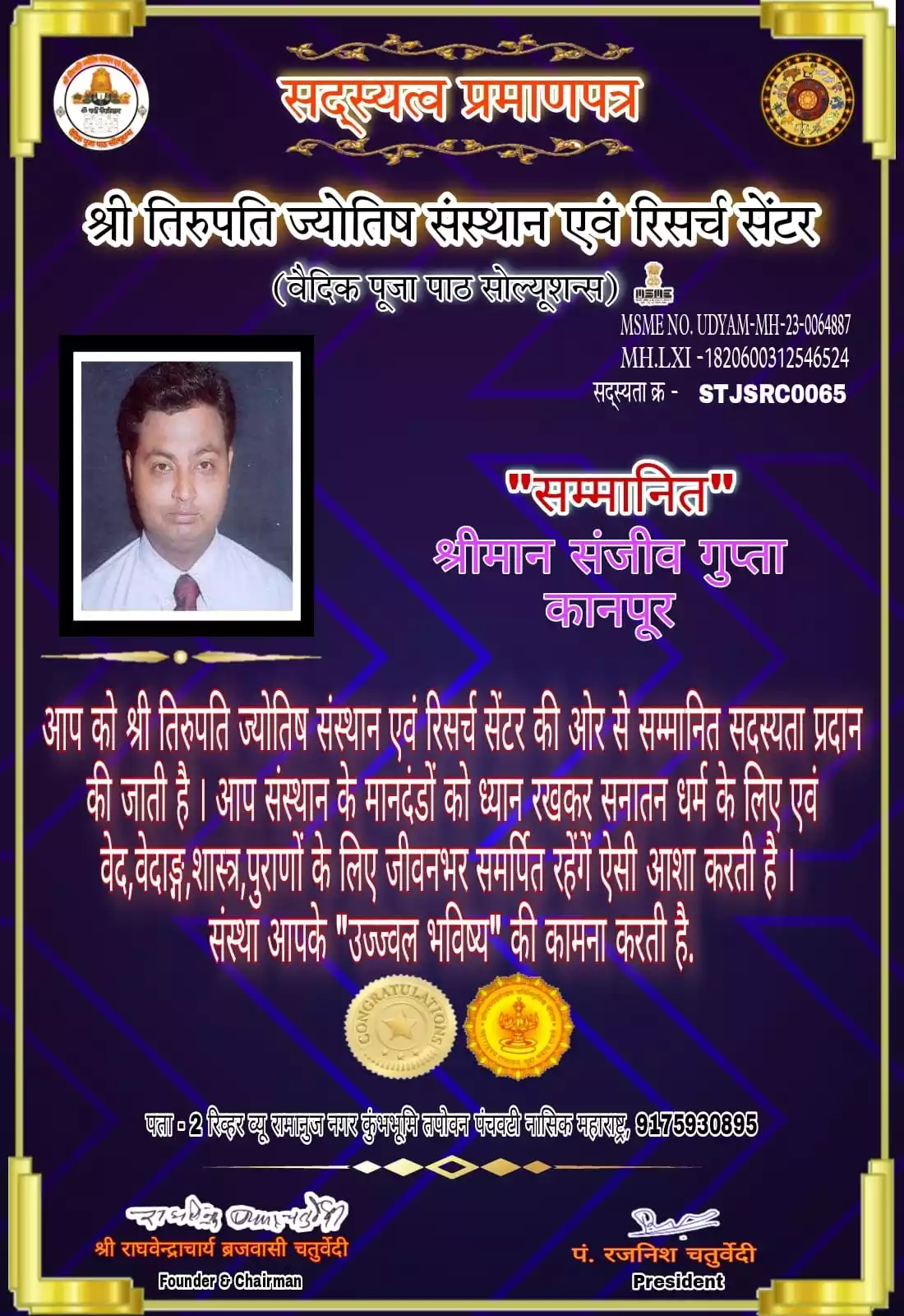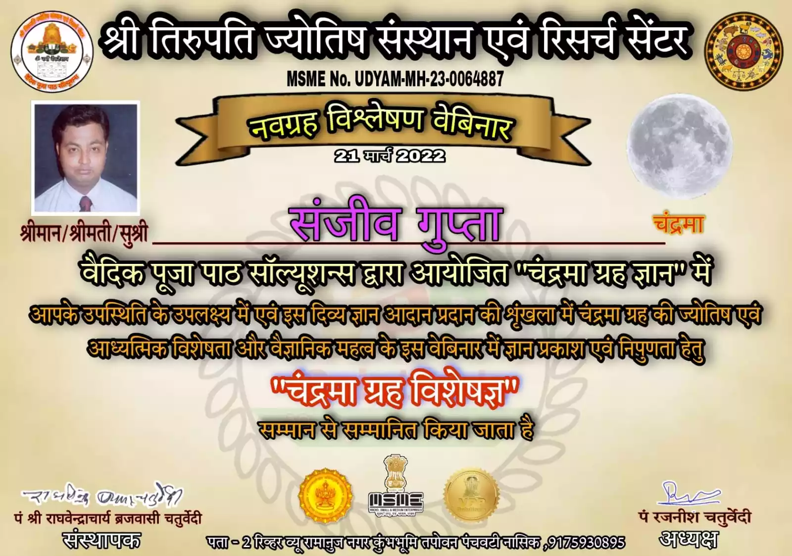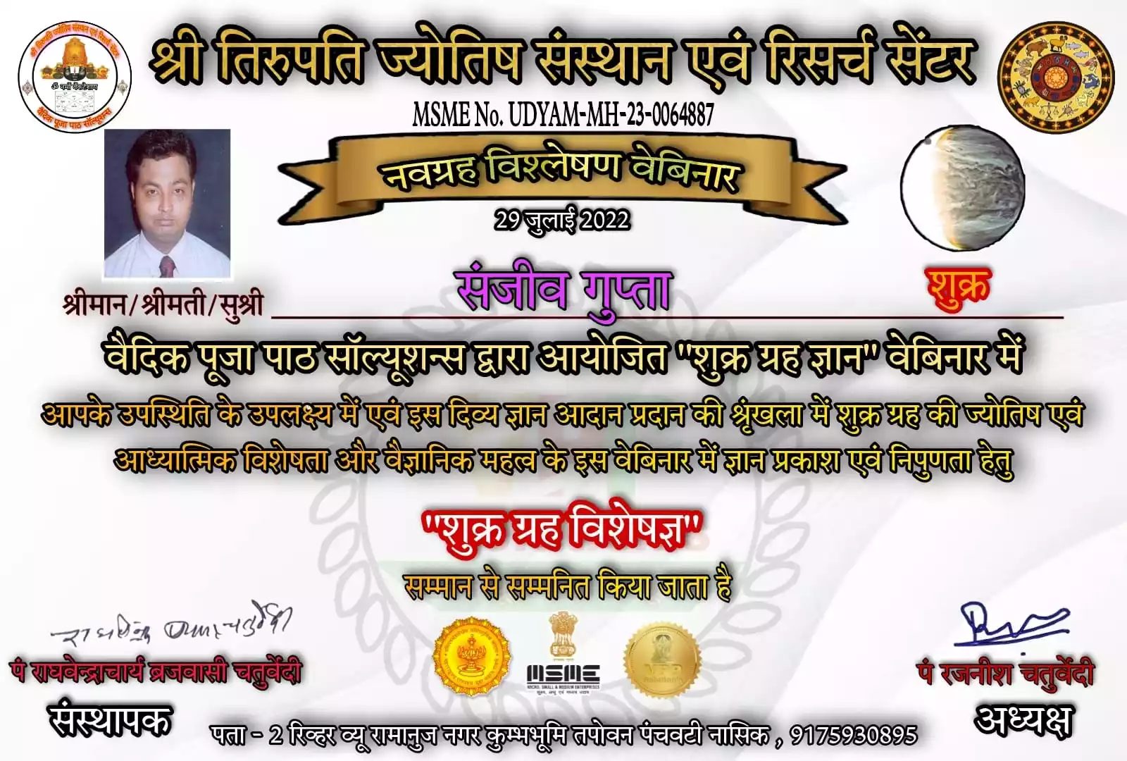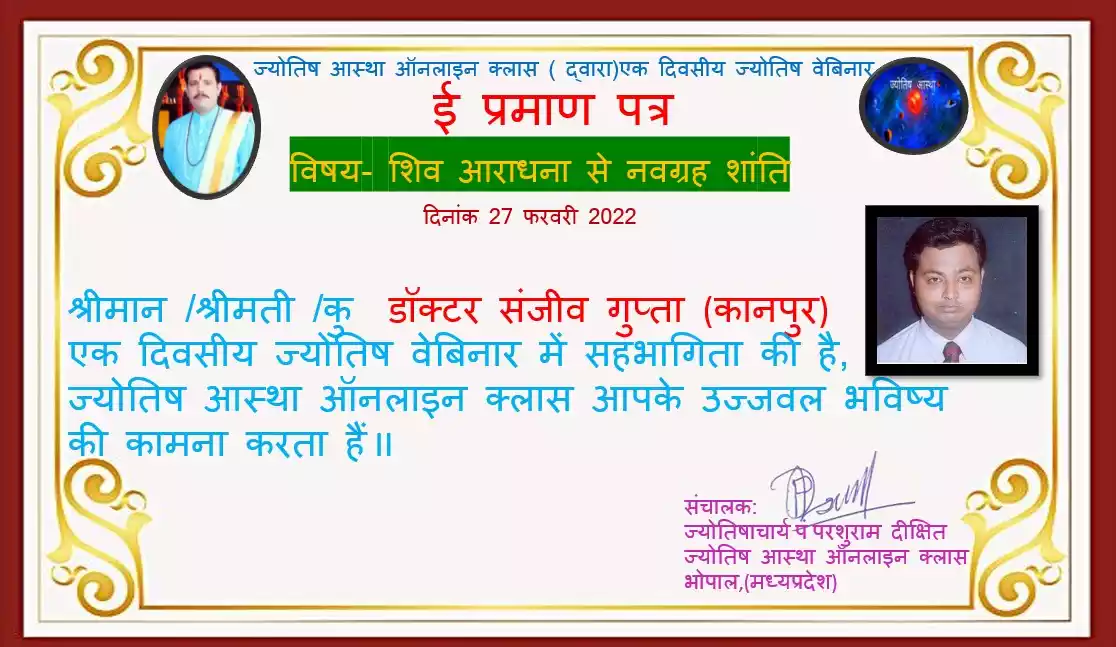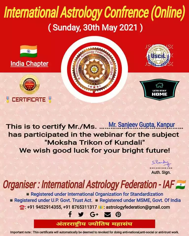Introduction Dr sanjiv gupta is a civil engineer by profession and a face reader and palmistry expert .Mr gupta has Best experience in astrology field more than 20 years.he is a poet and writer of social issues and social worker .Dr Sanjiv Gupta achieved more than 20 awards and certificates for participating in many astrology webinar and conference in India and abroad .He has a great knowledge and experience of indian and International astrology.