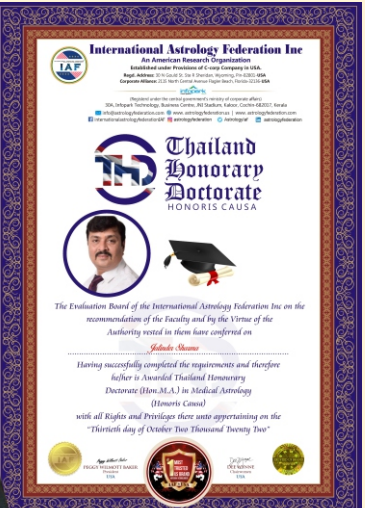 Dr.Jatinder sharma, the renowned astrologer with more than 16 years of experience and PHD .St at MCVA , honoured with Honorary Doctrate from IAF (International Astrology Forum USA ?? ) and Honorary Doctrate from IPCA ,NewDelhi ?,Appreciated by (LONDON BOOK OF RECORDS ?? ), Guest Astrologer at Renowned News paper and channel of India named PUNJAB KESARI performing weekly free live program on thier channel . Guest speaker at NRI CHANNEL ,CANADA ?? Also guest speaker as radio jockey 94.3 radio fm , A proven track record of accurate predictions.